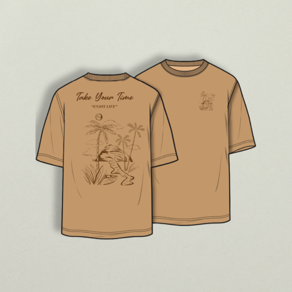 - Description: Embrace a laid-back vibe with the "Take Your Time" graphic tee, designed for those who savor life’s tranquil moments. Featuring an earthy, scenic print with palm trees and winding rivers, this t-shirt captures a relaxing beach escape in a minimalist sketch. Soft to the touch and designed with a relaxed fit, this tee is perfect for everyday comfort.